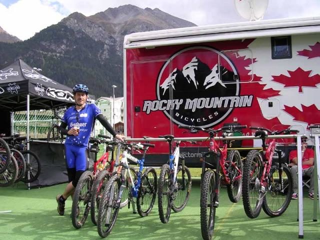 Werner und Dietmar gingen zu Rocky Mountain, da sind endlich die Teambikes aus Kanada für den RVW eingetroffen, „ETSX 70“ in der Teamlackierung Blau-Weiß. Mit den Bikes ging es dann wiedereinmal auf einen Gipfel, auf das Churer Joch. Auf dem Rückweg blieben wir im Bikepark hängen, hier hatten wir ganz schön Spaß auf den Rampen, Wippen und den North Shore Trails. Vom Churer Joch wieder zurück am Testival, mussten wir leider die Superbikes abgeben, die waren doch nicht für den RVW bestimmt, aber man kann sie käuflich für einen Sonderpreis von knapp 4100 € erwerben. Dirk hat der Versuchung nicht wiederstehen können, er musste zu dem Bergbeizli rauf.