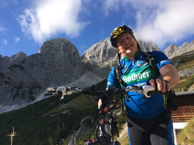 Schorsch´s Blutverlust wurde von der Hüttenwirtin verarztet und somit „weggeblasen“, sodass wir auf der Sonnenterrasse gemeinsam noch eine Halbe vor der Abfahrt genießen konnten.